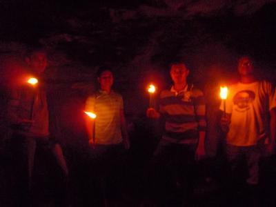 এরপর আলুটিলা ! খাগড়াছড়ির ট্যুরিস্ট স্পট বলতে মূলত এই আলুটিলাই বোঝানো হয়। পাঁচ টাকায় টিকেট আর দশ টাকায় মশাল কিনে আমরা আলুটিলা পাহাড় (টিলা আবার পাহাড় হয় কেমনে ?) বেয়ে নামা শুরু করলাম। এইটা নাকি খাগড়াছড়ির উচ্চতম পাহাড়। তবে টপ থেকে শহরের একটা দুর্দান্ত ভিউ পাওয়া যায়। আমরা সিড়ি বেয়ে পৌছালাম গুহার মুখে। ভিতর থেকে ধোয়া বেরিয়ে আসছে। মশালের ধোয়া। মশালগুলো জ্বালিয়ে প্যান্ট গুটিয়ে আমরা ঢুকে গেলাম ভেতরে। হাটু পানি, উচু নিচু পাথুরে বোল্ডার আর ঘুটঘুটে অন্ধকার।