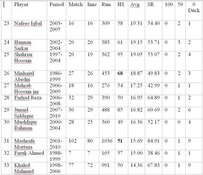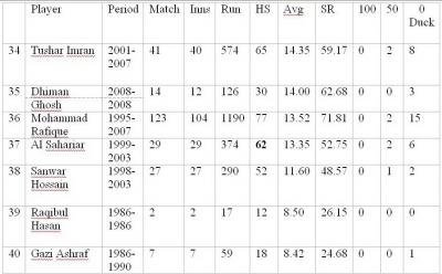 সাম্প্রতিক কালের বোলারদের স্থান দেয়া হয়েছে কিন্তু সাবেক অনেক যোগ্য খেলোয়াড়-সেখানে স্থান পায়নি। সবচেয়ে গড়মিল সে তালিকা - ইমরুল কায়েসের নাম নেই ??!!) । এটি অবশ্য ভুল নয়, কারন ওই তালিকায় শুধুমাত্র কমপক্ষে ২০টি ইনিংস খেলা প্লেয়ারদেরকেই স্থান দেয়া হয়েছে।