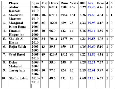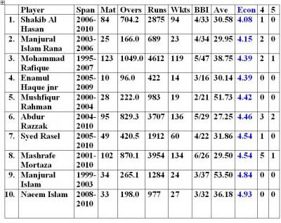 এই তালিকায় দেখা যাচ্ছে- আবদুর রাজ্জাক, মাশরাফি ১ আর ২ নম্বরে। মানজারুল ইসলাম রানা সব এই তালিকায় তিন নম্বরে সহ সকল তালিকাতেই একটা উল্লেখযোগ্য অবস্থানে আছেন। এমনকি ব্যাটসম্যান হিসাবেও। দুর্ভাগ্যজনকভাবে আমরা তাকে অকালেই চিরতরে হারিয়েছি। বিষ্ময়করভাবে রফিক উইকেটপ্রতি রান খরচার তালিকায় অনেকটাই নিচে। ৩৮ গড়ে ১৫ নং অবস্থানে।
