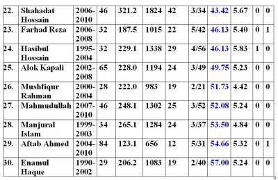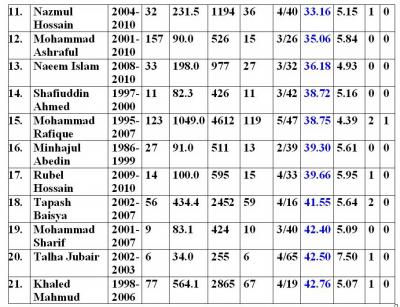 তালিকার শেষের দিক থেকে দু একজন কম খ্যাতির বোলারদের বাদ দিয়েছি যারা খুব কম খেলেছেন বা নব্বই এর দিকে খেলেছেন। যদিও সম্প্রতি খেলেছেন এরকম প্লেয়ারদের তালিকায় রেখেছি তাদের সম্ভাবনার কথা মাথায় রেখে। বোলারদের ক্ষেত্রে কয়েকভাবেই তালিকাটি সাজিয়েছি। প্রত্যেক তালিকার নীল অক্ষরের কলামটি হচ্ছে ঐ তালিকার বিবেচ্য বিষয়।