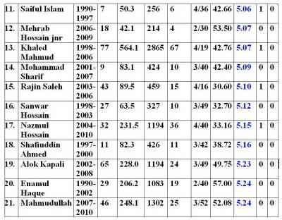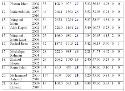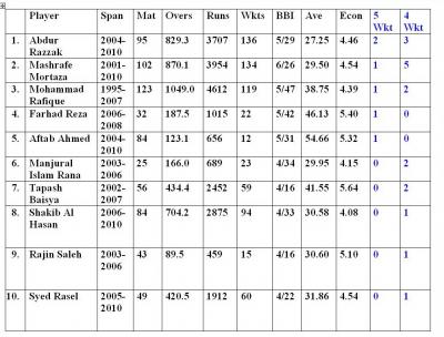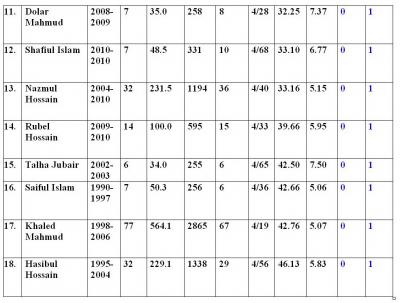 ৪. সব শেষে যে তালিকাটি দাড় করিয়েছি তাতে দেখা যাচ্ছে ৫ উইকেট শিকারী বোলার আমদের ৫ জন। এদের মধ্যে আবার আফতাব আর ফরহাদ রেজার মত পার্ট টাইম বোলার দুজন ও আছেন। বাকী দুজন বলাই বাহুল্য রফিক আর মাশরাফি। এই তালিকায় ৪ উইকেট শিকারের ক্রমতালিকাও পাওয়া যাবে যেখানেও আমাদের প্রয়াত রানা দুবার এই কৃতিত্ব দেখিয়েছিলেন।
