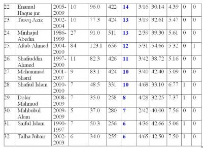 ৩. সর্ব্বোচ্চ উইকেট শিকারী আবদুর রাজ্জাক সবাইকে ছাড়িয়ে ১ নম্বরে উঠে গেছেন। এমনকি রফিক যেখানে ১২৩ ম্যাচে ১১৯ উইকেট লাভ করেছেন, সেখানে আবদুর রাজ্জাক ৯৫ ম্যাচ খেলেই ১৩৬ উইকেট পেয়ে গেছেন। ১৩৪ উইকেট পেয়ে মাশরাফি ২ নম্বরে। সাকিব যদিও তালিকার চার নম্বরে তবে এবং ৯৪ উইকেট পেয়ে আবদুর রাজ্জাকের থেকে ১১ ম্যাচ কম খেলে ৪২ উইকেট পিছনে। মজার ব্যাপার আমাদের চাচা ৯খালেদ মাহমুদ সূজন কিন্তু পাচ নম্বরে ৬৭ উইকেট পেয়ে। নতুনদের মধ্যে সৈয়দ রাসেল অনেকটা কম খেলেও এগিয়ে আসছেন দ্রুত।