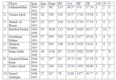 গড় রানের ভিত্তিতে মাহমুদুল্লাহ এখন পর্যন্ত সবার উপরে আছেন সবাইকে অনেকটাই পেছনে ফেলে।যদিও মাহমুদুল্লাহর শ্রেষ্ঠত্ব প্রমান করতে তাকে আরো অনেক ম্যাচ খেলে যেতে হবে। তামিম আশানুরূপভাবেই দ্বিতীয়। সাকিব তৃতীয়। হাবিবুল বাশার অনেকদিন পর্যন্ত তার শীর্ষস্থান ধরে রাখলেও এখন ৪ নম্বরে নেমে গেছেন।