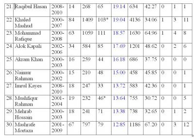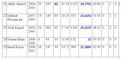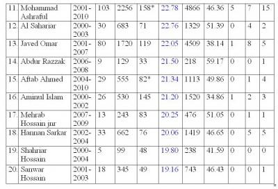 রাজিন সালেহকে যদিও গত দুইবছরে সিনিয়র প্লেয়ারদের ঝেড়ে ফেলার নীতিতে জাতীয় দল থেকে দূরে সরিয়ে দেয়া হয়েছে, কিন্তু এই রাজিন সালেহই দেখা যাচ্ছে ৪৬ ইনিংস খেলেও শীর্ষে থেকে তার টিকে থাকার যোগ্যতা প্রমান করেছেন। মাহমুদুল্লাহ রিয়াদ অল্প ম্যাচ খেলে যদিও দ্বিতীয় অবস্থানে, সামনের দিনগুলোতে তা বহাল থাকবে কিনা তা সময়ই বলে দেবে। তামিম ৩ নম্বরে । মানজারুল ইসলাম রানাও ৪ নম্বরে থেকে আমাদের স্মরন করিয়ে দেয় আমরা একজন গুণী ক্রিকেটারকে খুব জলদি চিরতরে হারিয়েছি।