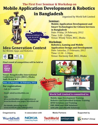 আর এই উপলক্ষ্যে World Soft Limited আয়োজন করতে যাচ্ছে ভিন্ন সব কর্মসূচি। এবারই প্রথম বাংলাদেশে আয়োজিত হতে যাচ্ছে একসাথে Mobile Application Development এবং Robotics & Embedded System এর উপর দুইদিন ব্যাপি Workshop এবং Seminar।