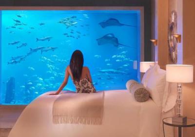 ওয়াটার বেড, নেপচুন এবং পোসাইডন আটলান্টিস হোটেলের সবচেয়ে এক্সক্লুসিভ সুইট, রুম এবং এর বাথরুম ২ টা থেকেই সমুদ্রের নিচের মনোরম দৃশ্য দেখা যায়