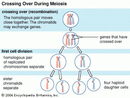 কিন্তু সন্তানের মধ্যে কি একদম বাবা মায়ের বৈশিষ্ট্যই থাকে শুধু? না সেটা অবশ্যই থাকে না। এখানে একটা ঘটনা ঘটে। ক্রসিং ওভার। ঘটনাটা ঘটে যখন গ্যামেট (শুক্রাণু এবং ডিম্বাণু) তৈরি হয় তখন। আপনার পিতা এবং মাতার মধ্যে থাকা তাদের পিতামাতার(অর্থাৎ আপনার দাদাদাদী বা নানানানী) কাছ থেকে পাওয়া জোড়ায় জোড়ায় থাকা ক্রোমোসোমগুলি(এরাই হোমোলোগাস) জোড় বেধে নিজেদের মধ্যে অংশ বিনিময় করে। এতে করে জিনে পরিবর্তন ঘটে এবং নতুন বৈশিষ্ট্যের সৃষ্টি হয়।