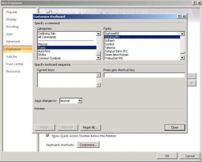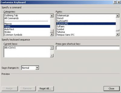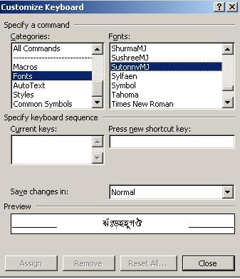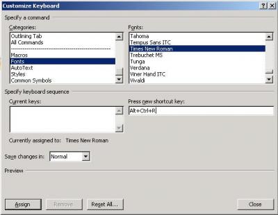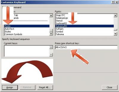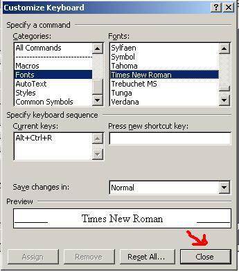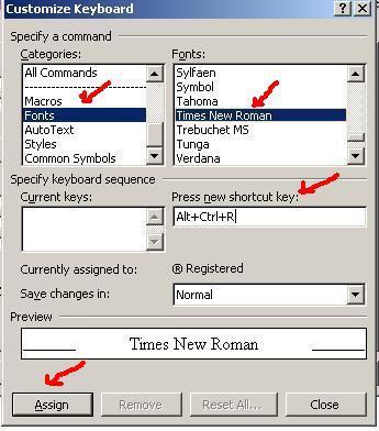 এরপর Fonts এর ঘর থেকে ইচ্ছামত যেকোন Font সিলেক্ট করুন। উদাহরণস্বরূপ আমি Times New Roman এ ক্লিক করলাম। এরপর খেয়াল করুন এই বক্সে Press new shortcut key: নামে একটি ঘর আছে। এখন এই Press new shortcut key: ঘরে কী-বোর্ড থেকে Ctrl+Alt চেপে আপনার পছন্দের যে কোন বর্ণ চাপুন এবং দেখুন Press new shortcut key: এর নিচের ঘরে Ctrl+Alt +আপনার নির্বাচিত বর্ণ চলে এসেছে। (যেমন আমি করেছি Ctrl+Alt+R)। এরপর বক্সের একদম নিচে বাম পাশে Assign এ ক্লিক করুন।