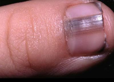 নখের নিচে গাঢ় রেখাঃ এ ধরনের অবস্থা খুব আশঙ্কাজনক অবস্থার প্রকাশ করে থাকে। তাই এ ক্ষেত্রে জরুরী ব্যবস্থা নেয়া প্রয়োজন।