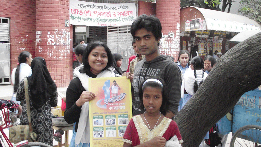 ইউনিফর্ম পরা মেয়েটি আমার ছোটবোন,মিরপুর গার্লস আইডিয়াল স্কুল এন্ড কলেজের শিক্ষার্থী। আর ছোট যে মেয়েটিকে দেখলেন, সে এক পথ শিশু। অনেকক্ষণ আমাদের পোস্টার দেখে ছবি তোলার সময় দৌড়ে এসে বললো "আমাকেও তোলেন"! তারপর আমাদের হাত থেকে পোস্টার নিয়ে উপস্থিত কয়েকজন ছাত্রীর কাছে পোস্টার বিলি করে।