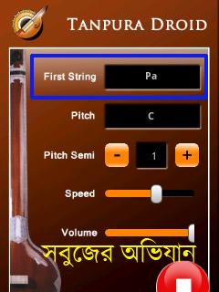 Frist String এর সাধারণত ‘পা’ সিলেকসান করে নিতে হয়।সব রাগে-রাগিনীতেই মোটামুটি ‘পা’ সিলেকসান করে নিতে পারো।তবে প্রয়োজনে বাদী বা সম্বাদী অনুযায়ী অন্য কোনো স্বরও তুমি সিলেকসান করে নিতে পারো। নিচে দেখ সেই অপসানও রাখা আছে ।