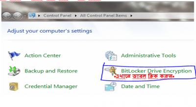 অন্তত আমি অনেক চেষ্টা করেও পারিনি, তাহলে এবার কার্যক্রম শুরু করা যাক। প্রথমে start মেনু থেকে Control panel এ প্রবেশ করুন “Bitlocker Drive encryption” এ ডাবল ক্লিক করুন। (নিচের স্কিন শটগুলো লক্ষ করুন)