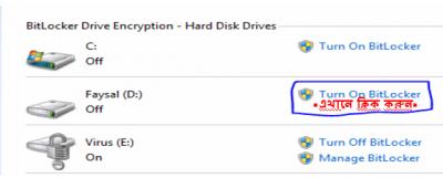 এখন আপনি যে ড্রাইভ টি লক করতে চান সেই ড্রাইভের Turn on BitLocker এ ক্লিক করুন। নিচের স্কিন শটটির মতো একটি ডায়ালগ বক্স আসবে।