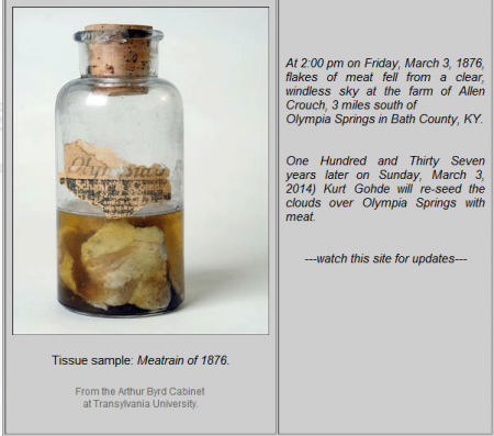 ঘটনাটা ১৮৭৬ সালের ।অলিম্পিয়ানের কেন্টাকি ।সেখানেই ঘটল মাংস বৃষ্টির আজব এই ঘটনা ।বলা নেই কওয়া নাই পরিষ্কার আকাশ থেকে পড়ল তিন ইঞ্চি মাংসের টুকরোগুলো !! আর মাংসগুলোর স্বাদ নাকি ছিল হরিণ বা মহিষের মাংসের মত!!! বৃটেনের মাক্রোস্কপিকাল রয়েল সোসাইটি ধারনা করে যে , হয়তবা কিছু বাজপাখি কোনো মৃত প্রানীর মাংস খায় এবং তারা তা ঐ শহরের উপর উগরে দেয় ।
