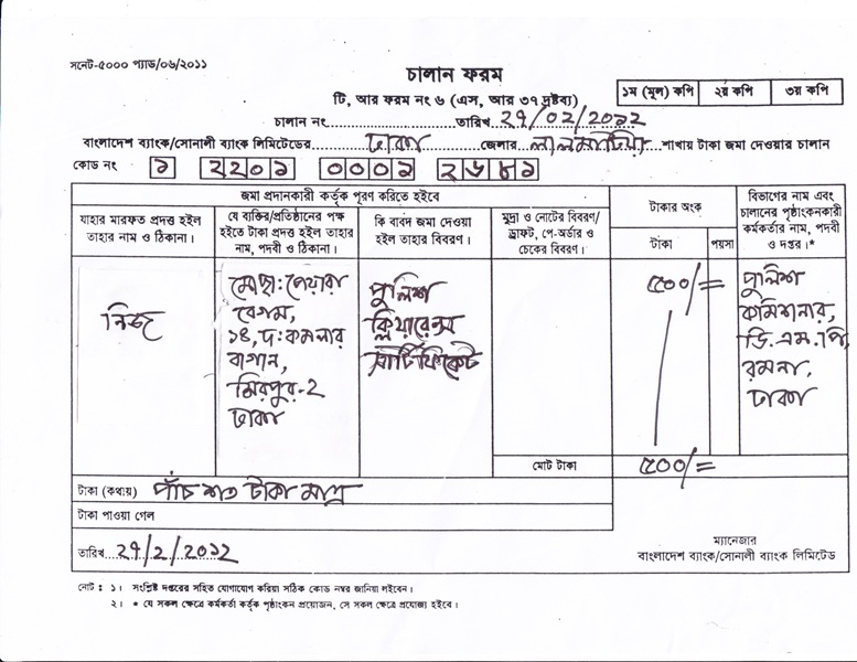 প্রথমেই 'সোনালী ব্যাংক' থেকে পাঁচশত (৫০০/=) টাকার ট্রেজারী চালান কাটুন। আপনার বাড়ির নিকটস্থ সোনালী ব্যাংকে গিয়ে (যেখানে ট্রেজারী চালান জমা নেয়া হয়) 'ক্যাশ গ্রহণ' কাউন্টার থেকে একটি ট্রেজারী চালান ফরম (মূলকপি) নিন। এরপর চালানের এই মূল কপিটি নিচের ছবি অনুসরণ করে সঠিকভাবে পূরণ করুন: