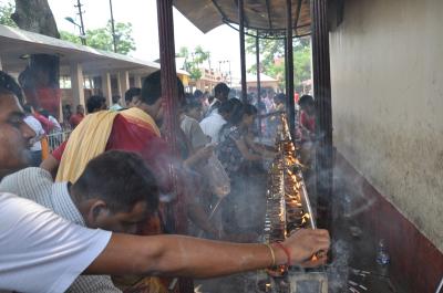 রবিবার ছুটির দিন বলেই মনে হয় আজ ভিড়টা অন্যান্য দিনের চেয়ে বেশি। পায়ে পড়ে থাকা স্যাণ্ডেল একটা দোকানে রেখে তিনজন খালি পায়ে কামাক্ষ্যা মন্দিরের ভেতরে ঢুকে পড়লাম। অসম্ভব গরমে মন্দিরের ফোরে দাঁড়িয়ে থাকা যাচ্ছেনা। তাই ছায়া খুঁজে নিয়ে ছবি তুলতে থাকলাম।