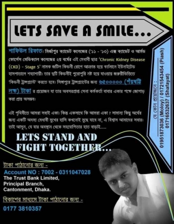 এভাবেই কি আমরা পরাজিত হবো? হেরে যাবো বিবেকের কাছে? একজন ভবিষ্যতের ডাক্তার শেষ নিঃশ্বাস ত্যাগ করবে আমাদের চোখের সামনে? শাফিউল আহমেদ রিফাত, মির্জাপুর ক্যাডেট কলেজের এক্স ক্যাডেট ('০৭ - '১৩) ও আর্মড ফোর্সেস মেডিক্যাল কলেজের ২য় বর্ষের মেধাবী এই ছাত্র।