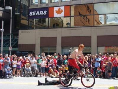 এক জায়গায় সাইকেল খেলা হচ্ছিল।একজন শুয়ে আছে রাস্তায়।অন্যজন তার উপর দিয়ে সাইকেল চালাচ্ছে।চারিদিকে গোল হয়ে বসে ,কেু কেউ দাঁড়িয়ে খেলা দেখছিলো।
