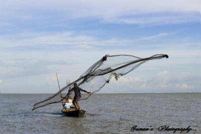 অনেকক্ষণ বসে থাকতে হয়েছিল আমাদের সবাইকে জেলে কখন জাল ফেলবে। যেই না উনি জাল ছুঁড়ল, অমনি সব্বাই একসাথে ক্লিক ক্লিক ক্লিক। আমিও ৫ টা শট পেয়েছি, তার মধ্যে থেকে এটা শেয়ার করলাম। পদ্মায় তোলা।