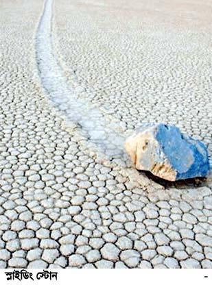 ক্যালিফোর্ণিয়ার Racetrack Playa, Death Valley-তে এমন বিশ্বয়কর ঘটনাটি বিশেষজ্ঞদের নজরে আসে ১৯৪৮ সালে। হঠাৎ তীব্র বাতাস, কাদামাটি, বরফ, তাপমাত্রার তারতম্যতা বিভিন্ন বিষয় পাথরের সরে যাওয়ার পেছনে কারণ বলে বিজ্ঞানীরা মনে করলেও পাথরের চলার পথের ভিন্নতার কারণে রহস্য থেকেই যায়। পাথর গুলোর এক একটি কয়েক বছর ধরে চলে। কখনো সরল পথে, কোনটি বাঁকানো পথে পরিভ্রমণ করে। এমনও হয় দুটি পাথর সমান্তরালে কিছুদূর পর ঠিক বিপরীত দিকে তাদের দিক পরিবর্তন করে।