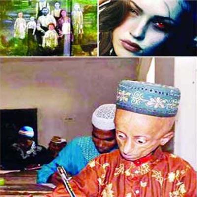 নীল চামড়ার পরিবার উপরে বামে, ভ্যাম্পায়ার ডিজিজ উপরে ডানে ও প্রোজেরিয়া রোগে আক্রান্ত বাংলাদেশের কিশোর আমির হামজা এসএসসি পরীক্ষা দিচ্ছে (ছবির নীচে)।