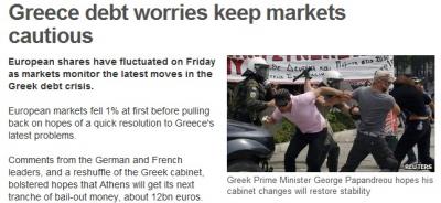 গ্রীস ঋণ সমস্যায় আছে। মানে গ্রীসের অর্থনীতি খারাপ অবস্থানে আছে। আপনি যদি চার্টে দেখেন ইউরো'র দাম কমছে তাহলে আপনি কেন কমছে তার কারণ জানেন। ঐ সময় ইউরো কিনার আগে আপনি আরেকবার হলেও ভাববেন।
