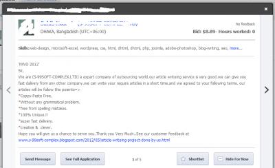 ধরে নেই আপনার মধ্যে এই পাঁচটাই আছে। এইবার প্রথমেই প্রশ্ন আসে কি কাজ করবেন। উত্তর সোজা- যা আপনি করতে পারেন বা করতে পারবেন। আপনার ইংলিশ লেখা চমতকার? হয়ে যান কনটেন্ট ডেভেলপার। আপনি ওয়েব ডিজাইনে দক্ষ? মানুষজনকে তাহলে ওয়েবসাইট তৈরি করে দিন। মোট কথা, যে কোন সার্ভিস আপনি দিতে পারেন। তবে এমন কোন সার্ভিস দিতে যাবেন না যা আপনি পারেন না। তাতে নিজের এবং অন্যের সময় নষ্ট হবে। এই প্রসঙ্গে একটা অভিজ্ঞতা শেয়ার করি। ওডেস্ক-এ আমি মাঝে মাঝে জব পোস্ট করি। তো এইরকম এক আর্টিকেল লেখার কাজে নিচের আবেদনখানি পেয়েছিলাম-