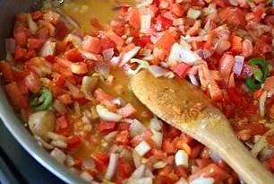 ২।এরপর ৩/৪ টা বড় সাইজের টমেটো ছোট ছোট টুকরো করে ছেড়ে দিন পেয়াজ একটু গোলাপি হলে। এর সাথে যোগ করুন অল্প হলুদ আর ২ টেবিল চামচ কারি মশলা( না দিলেও প্রব্লেম নাই)। আধা কাপ মটরশুটি দিন টমেটোর সাথে। এখন অপেক্ষা করুন টমেটো সিদ্ধ হবার জন্য।