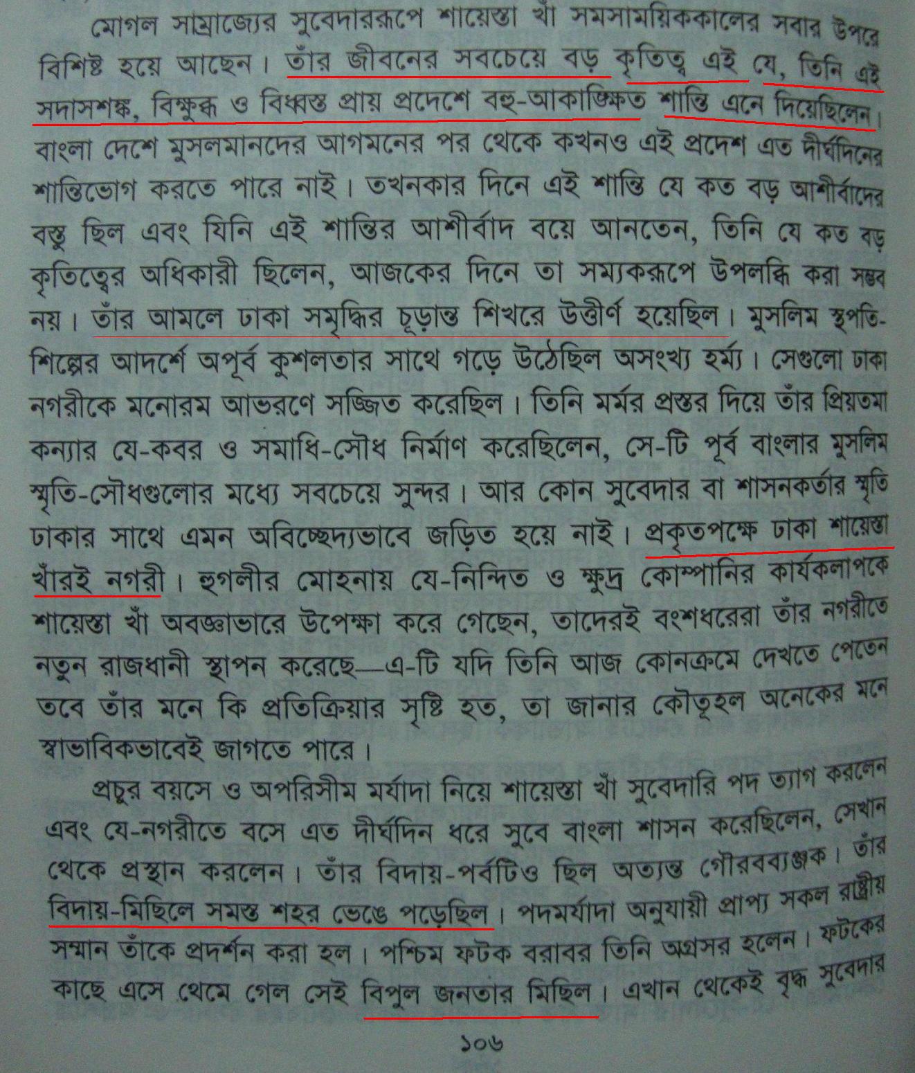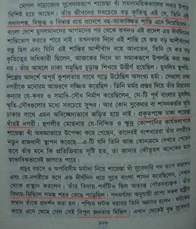 শায়েস্তা খাঁর আমল নিয়ে কিছুটা পড়া ছিল এফ. বি. ব্রাডলী বার্ট রচিত ‘রোমান্স অব অ্যান ইস্টার্ন ক্যাপিটাল’ (প্রাচ্যের রহস্যনগরী, অনুবাদ- রহীম উদ্দীন সিদ্দিকী) নামের বইটির কল্যানে। ৮ম শ্রেণীর বইয়ে লেখা ইতিহাস পড়ে অবাক হলাম। আমরা যে ইতিহাস জেনে এসেছি এতোদিন এবং ব্রাডলীর বইয়ে যেভাবে শায়েস্তা খাঁ সম্পর্কে জেনেছি তার সাথে কোনভাবেই মেলাতে পারলাম না।