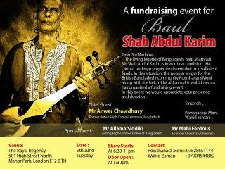 বাউল শাহ আব্দুল করিম বাংলা বাউল গানের প্রাণ , আমাদের বাউল সংস্কৃতির চিরায়ত উত্তরাধিকার । মারাত্মক অসুস্থ বাউল শাহ আব্দুল করিমের সুচিকিৎসা ব্যাহত হচ্ছে এমন খবর আমাদের জন্য দুঃখজনক । বাউল শাহ করিমের সাহায্যর্থে লন্ডনের রয়েল রিজেন্সি হলে আগামী ৯ই জুন অনুষ্ঠিত হবে বিশেষ চ্যারিটি শো । লন্ডনের স্থানীয় শিল্পী ,কলাকুশলীদের উপস্থিতিতে মনোরম এই সাংস্কৃতিক সন্ধ্যা হউক বাউল করিমের গানের প্রতি আমাদের আকুন্ঠ সমর্থন ও সহমর্মিতার আপ্লুত বহিঃপ্রকাশ । সংগীতের বাণিজ্যিকরনের এই যুগে , অসুস্থ মহান এই বাউল সাধকের প্রতি আমাদের সব শুভকামনা ।