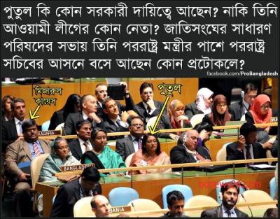 পুতুল কি কোন সরকারী দায়িত্বে আছেন? নাকি তিনি আওয়ামী লীগের কোন নেতা? জাতিসংঘের সাধারণ পরিষদের সভায় তিনি পররাষ্ট্র মন্ত্রীর পাশে পররাষ্ট্র সচিবের আসনে বসে আছেন কোন প্রটোকলে? আর পররাষ্ট্র সচিব মিজারুল কায়েস ই বা ফাইল বগলে নিয়ে পেছনের সারীতে পিএস এর আসনে বসলেন কোন আক্কেলে? এরা কি রাষ্ট্রের নিয়ম-কানুন প্রটোকল সব ভুলে গেছে।