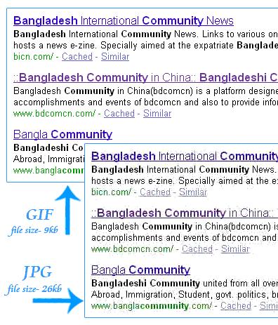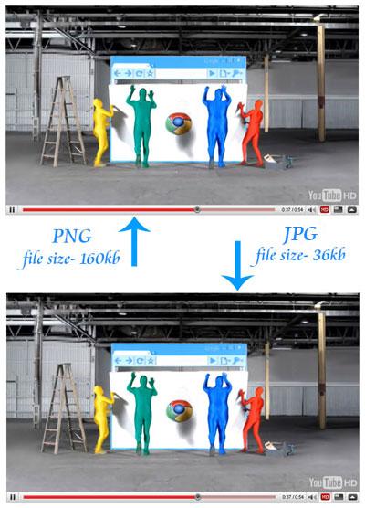 উদাহরন স্বরুপ, ইউটিউব থেকে নেয়া গুগোল ক্রম এড এর একটি স্ক্রীনশট দেখুন। PNG ফরমেটে সেভ করলে এর সাইজ দাঁড়ায় 160kb, সেখানে JPG ফরমেটে সেভ করলে এর সাইজ দাঁড়ায় মাত্র 36kb। কিন্তু কোয়ালিটি প্রায় সমান।