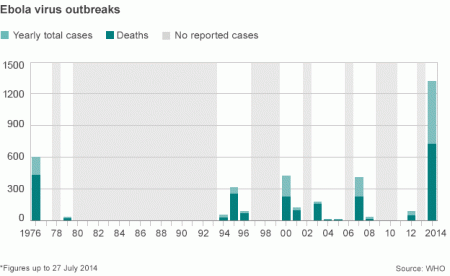 ১৯৭৬ সালে কংগোর জিয়েরা এলাকায় প্রথমবারের মত এ রোগটি ধরা পরে। সেখানে ৩১৮জন আক্রান্ত হয় যার মধ্যে ২৮০জন(৮৮%) মারা যায় এবং পরবর্তীতে সুদানে তা ছড়িয়ে পরে এবং সেখানে ২৮৪ জন আক্রান্ত হয়ে ১৫১জন মারা যায়(৫৩%)। তবে এইবার এই রোগের প্রাদুর্ভাব দেখা দেয় নতুন করে মার্চ মাসে(২০১৪) গিনিয়াতে এবং খুব দ্রুত ছড়িয়ে পরেছে পশ্চিম আফ্রিকার অন্যান্য দেশগুলোতে যথা লিবিরিয়া, সিয়িরা লিওন, নাইজেরিয়াতে। এবং এবার আগের সব রেকর্ড ভেংগে ফেলেছে! আজকের দিন পর্যন্ত টোটাল ১৩২৩ জন এই রোগে আক্রান্ত হয়েছে এবং যার মধ্যে ৭২৯ জন মারা গিয়েছে(৫৫%)। সবচেয়ে ভয়ংকর ব্যাপার হচ্ছে ৬০ জন স্বাস্থ্য কর্মী মারা গেছে যারা এই রোগের আক্রান্ত রোগীর সেবায় নিয়োজিত ছিলো!