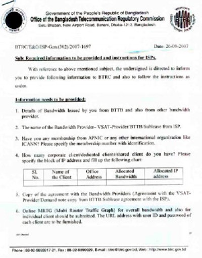 বিটিআরসি বাংলাদেশের সব আইএসপির কাছে একটি চিঠি (BTRC/E&O/ISP-Gen.(302)/2007-1697) পাঠিয়েছে যেখানে তারা চেয়েছে: