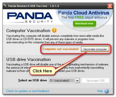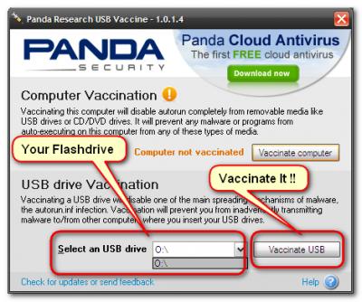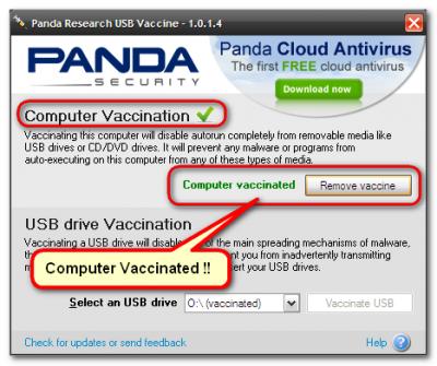 পান্ডা এন্টিভাইরাসের নাম হয়ত অনেকেই শুনে থাকবেন। তারা একটি সফটওয়্যার বানিয়েছে এবং সেটির নাম দিয়েছে- Panda USB Vaccine. এটি সেটাপ করার পর একটি ক্লিক করলেই পেনড্রাইভ অথবা মেমোরিকার্ড Vaccinate হয়ে যাবে অর্থাৎ আপনার ফ্লাশড্রাইভে টিকা দেয়া হয়ে যাবে!! যাতে করে অটোরান ভাইরাসকে আপনি আর জোড় করেও ঢুকাতে পারবেন না।!!