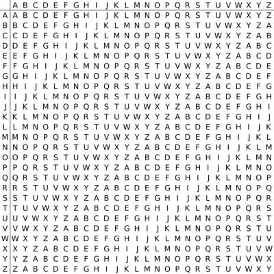 এতে ২৬x২৬ কম্বিনেশন থাকে। ধরেন আমরা একটি Cipher text "LXFOPVEFRNHR" Plain text করবো। এখন আমাদের দরকার হবে এর Key। এর Key হল "LEMON" । এখন আমরা এইভাবে সাজাতে পারি --