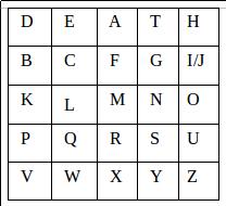 আপনারা নিশ্চয় National Treasure: Book of Secrets মুভি টি দেখেছেন, এই মুভি তে দেখা যায় কেজ সাহেব একটা ফাইভ লেটার কীওয়ার্ডের জন্যে হন্যে হয়ে বেরান তার দাদার রেখে যাওয়া এক Cipher এর অর্থ উদ্ধারের জন্য। মুভিতে যে Cipher এর কথা বলা হয় তা হল Playfair cipher । এক্ষেত্রে একটি কীওয়ার্ড থাকে। ধরা যাক কীওয়ার্ড হল DEATH (মুভি তে এটাই ছিল