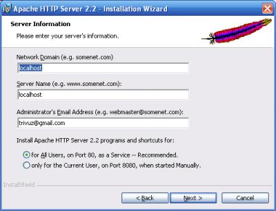 প্রথমে অনলাইন থেকে অ্যাপাচি ওয়েব সার্ভার ডাউনলোড করে নিতে এই লিঙ্কে যাও- Click This Link । এখান থেকে MSI Installer Package টি (যেমন, win32-x86-no_ssl.msi) ফাইলটি নামিয়ে নাও। এবার সাধারণ সফটওয়্যার সেটাপ করার মত করে সেটাপ শুরু করো। ইনস্টলারটি তোমার কাছে কিছু তথ্য(Server Information) জানতে চাইবে। নিচের মত করে তথ্যগুলো পুরণ করে নিতে হবে-