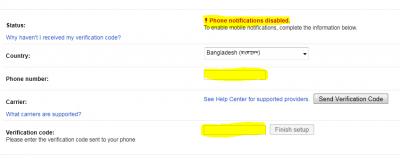 সেখানে যদি লেখা থাকে !Phone notification disabled. তাতে ভয়ের কিছু নেই । এখনি তা এনাবল হয়ে যাবে । Phone number ঘরে ফোন নম্বর লিখন । তারপর Send Verification Code বাটনে ক্লিক করুন । আপনার মোবাইলে একটি ভেরিফিকেশন কোড আসবে । তা নিচের ঘরে লিখন এবং Save বাটনে ক্লিক করুন । Phone number successfully validated. লেখাটি আসলে নিশ্চিন্ত মনে গুগলে কেলেন্ডার ব্যবহার শুরু করুন ।