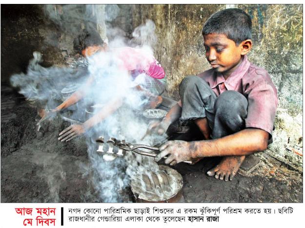 দৈনিক প্রথম আলোতে প্রকাশিত মে দিবসের এই ছবিই বলে দিচ্ছে বাংলাদেশে শিশুশ্রম বন্ধ হয়নি। বরং আগের চাইতেও ভয়াবহ রূপ ধারণ করেছে। শিশুদের দিয়ে খুব সহজেই মিথ্যা বলে খারাপ কাজ করানো যায়, অপরাধ-জগতেও শিশুদের দিয়ে মাদক-ব্যবসা, মাদক চোরাচালান, চুরি-ছিনতাই এর মতো গুরুতর অপরাধ করানো হয়ে থাকে। ঢাকা শহরের পথে-ঘাটে-রাস্তায় যত শ্রমজীবী, পপকর্ন-ফুল বিক্রেতা শিশু-কিশোরদের দেখা যায় বিশ্বের আর কোন উন্নয়নশীল দেশে কী এমনটা আছে? আমরা কী কখনো সেটা ভেবে দেখেছি? বরং নিজেদের জানালার কাঁচ বন্ধ করে নাক সিঁটকাতেই বেশি পুলক অনুভব করি। কখনো ভেবেও দেখি না, এই শিশুগুলোকে পুনর্বাসন না করলে, এক বেলা খাবারের ব্যবস্থাও ঠিকমতো না করতে পারলে একটা ভয়াবহ ও ঝুঁকিপূর্ণ গোষ্ঠীর জন্ম হবে। যারা খুনি-ছিনতাইকারি হবে, ভেতরে বড়লোক-গাড়িওয়ালাদের প্রতি তীব্র ক্ষোভ জন্মাবে। আমরাই এদের ফ্র্যাংকেনস্টাইন হবার পথটা তৈরী করে দিচ্ছি নিজেরাই হত্যা করছি এদের বিবেক কে। অন্তত আমাদের একজনকে এদের পাশে দাঁড়িয়ে বিরল দৃষ্টান্ত স্থাপন করতে হবে। আবার মোরশেদুল ইসলামদের মতো হলে চলবে না। যারা শিশু চলচ্চিত্র উৎসবের নামে ইউনিসেফ, মানুষের জন্য ফাউন্ডেশন, ওয়ারিদ (বর্তমানে এয়ারটেল) প্রভৃতি বহুজাতিক প্রতিষ্ঠানগুলোর কাছ থেকে কোটি টাকা হাতিয়ে নেয় কিন্তু এইসব রাস্তার শিশুদের জন্য কিছুই করে না। নামেমাত্র দুই-একজনকে ধরে নিয়ে এসে তামাশা বানায়। এরাই মূলত সমাজের মূল অবক্ষয়ের জন্য দায়ী। পকেটে মিথ্যা বলে পয়সা ভরবো, কামের কাম কিছুই করবো না- এই নীতিতে বিশ্বাসী। বাংলাদেশ পরিসংখ্যান ব্যুরোর জরিপ থেকে দেখা যাক -
