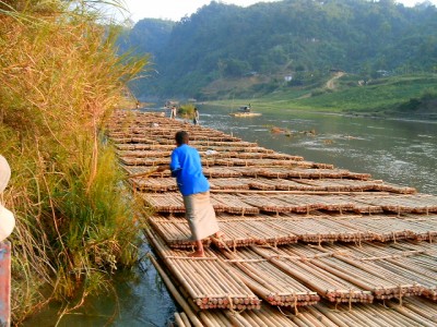 এইটা রুমা নদীর একটা বাঁকের ছবি। ক্ষ্যইক্ষংছড়ি থেকে নৌকা নিয়ে রুমা বাজারে পৌঁছানোর পথে। বাঁশের ভেলা বানায়া বাঁশা ঠেলতাছে, যাকে বলে বাঁশ পরিবহন।