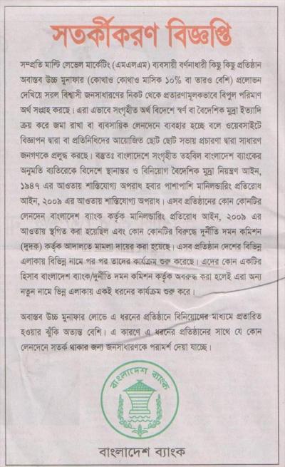 আশা করি, আজ সকালের নানা প্রত্রিকায় বাংলাদেশ ব্যাংকের এমন একটা সতর্কীকরন বিজ্ঞপ্তি দেখেছেন। না দেখে থাকলে দেখে নিতে পারেন। তবে আমার মনে হয় বাংলাদেশ ব্যাংক তথা সরকার এ বিষয়ে অনেক দেরী করে ফেলেছেন। এ সব মাল্টি লেভেল মার্কেটিং কোঃ দের বিরাট বিচার হওয়া উচিত।