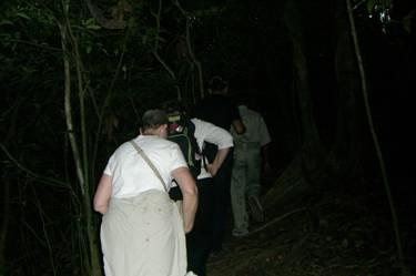 হাইকিং রুটে সূর্যের আলো ঢুকে না বললেই চলে। হঠাৎ হঠাৎ গাছের পাতা ভেদ করে আলোক রশ্মি চোখে পড়ে। হাঁটতে হাঁটতে এক পর্যায়ে এসে দেখলাম একটা মাচা করে খাট লাগানো আছে। মশারি টাঙ্গানো। পাশেই একটা টয়লেট। সেখানে হারিকেন জ্বালানোতে ব্যস্ত একজন বিদেশী কে দেখা গেল। গাইড বললো- এই ভদ্রলোক রাত কাটাবে এখানে। আর ভয়ংকর প্রানীদের থেকে রক্ষা করার জন্য বন্ধুকধারী গার্ড আছে জায়গায় জায়গায়। আমি মনে মনে ওস্তাদ কে সাবাশী দিলাম।
