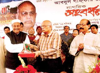 অমর একুশের রচয়িতা কবি ও প্রখ্যাত সাংবাদিক আবদুল গাফ্ফার চৌধুরীকে গতকাল নাগরিক সংবর্ধনা অনুষ্ঠানে ক্রেস্ট প্রদান করেন চট্টগ্রামের মেয়র মহিউদ্দিন চৌধুরী - যাযাদিন।