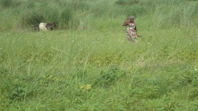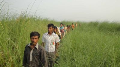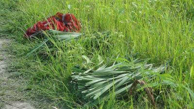 চরের ফসলি জমিতে এক ধরনের আগাছা জন্মায় যার পাতা থেকে পাটি তৈরী করা যায়। দুই বালিকা এই গাছের পাতা তুলতে ব্যস্ত।