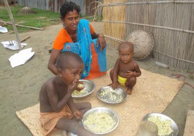 এক মা তার দুই শিশুকে নিয়ে নাস্তা করছে।