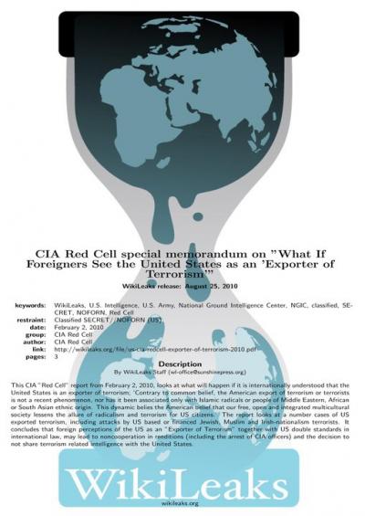 আফগান যুদ্ধের ৯২ হাজার গোপন সামরিক দলিল ফাঁস করে বিশ্বজুড়ে আলোচিত উইকিলিকসের কর্মকান্ডে বিপাকে পড়েছে খোদ ওবামা প্রশাসন। তাই আমেরিকার স্বার্থে আঘাত হানে এমন তথ্য প্রকাশে বিরত থাকতে আনুষ্ঠানিকভাবে উইকিলিকসকে অনুরোধ করেছিল পেন্টাগন। কিন্তু তাতেও কোনো কাজ হয়নি। এবার সিআইএর গোপন দলিল ফাঁস করে আবারো বিশ্বব্যাপী আলোচনার ঝড় তুলেছে উইকিলিকস। নতুন প্রকাশিত এ দলিলে আমেরিকাকে বিশ্বব্যাপী সন্ত্রাস রপ্তানিকারক দেশ হিসেবে দেখানো হয়েছে।