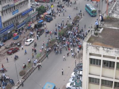 বাইরে চরম গোলাগুলির শব্দ। জানলা দিয়ে বেশ কিছু ছবি নিলাম। দুরে আগুন জ্বলছে দেখে মনে পড়ল নিচে রাখা মটরসাইকেলের কথা। দৌড়ে নেমে এলাম ১০ তলা থেকে লিফট ছাড়া। করিডোরের মতো সরু পথে মানুষের ভীড় ঠেলে সামনে এগুতেই টিয়ার সেল এসে পড়ল কাছে, হুড়মুড় করে জনগন দ্রুত উপরে উঠতে সিড়িঘরে চরম বিশৃঙ্খলা। সাহস করে রাস্তায় যেতে চাইলাম কারন গাড়িটা নতুন। হঠাৎ চোখে মুখে যেন শর্ষে ফুল দেখতে লাগলাম। টিয়ার সেলের তীব্র ঝাঝাল গন্ধ আমার নাক থেকে মস্তক অবদি খবর করে দিল। কিছু লাইভ ছবি শেয়ার করলাম।
