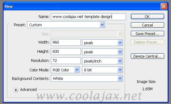 ১। প্রথমেই Photoshop 7.0/CS/CS2/CS3 টি চালু করুন। এবার Ctrl+N চেপে নতুন একটি ফাইল ওপেন করে নিন। আমরা ফাইলটির সাইজ নিচ্ছি ৯৬০ বাই ৯০০। অর্থ্যাৎ ইমেজটির প্রস্থ (width) হবে ৯৬০ আর উচ্চতা(height) হবে ৯০০। ফাইলটি একটি নাম দিয়ে দিন। পরর্বতীতে এই নামেই আপনার ইমেজটি সেভ হবে।