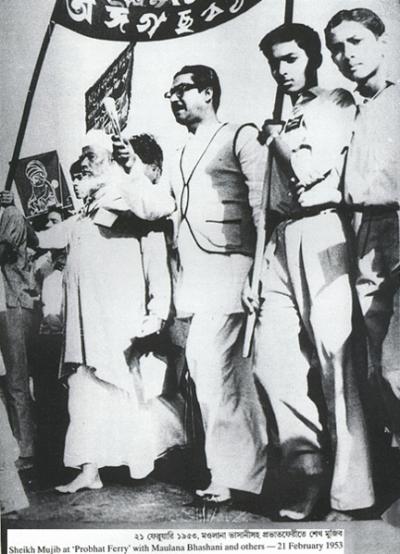 Sheikh Mujibur Rahman (3rd person from right) and Maulana Bhashani (4th person from right) in 1953